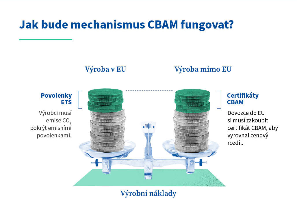 EU plánuje vyřešit problém nejednotných pravidel pro stanovení ceny uhlíku, a sice zavedením Mechanismu uhlíkového vyrovnání na hranicích. Pro Evropské firmy platí od roku 2005 systém obchodování s emisními povolenkami (Emission Trading System, EU ETS, více o něm a jeho reformě níže). Pro firmy ze třetích zemí ale stejná povinnost nakoupit emisní povolenku za tunu vypuštěného oxidu uhličitého neplatí. CBAM (Carbon Border Adjustment Mechanism) má tuto nerovnováhu narovnat a v souladu s pravidly mezinárodního obchodu poskytnout rovné podmínky pro výrobce v rámci EU a dodavatele ze třetích zemí. CBAM je tedy jakýmsi doplňkem stávajícího evropského emisního trhu.