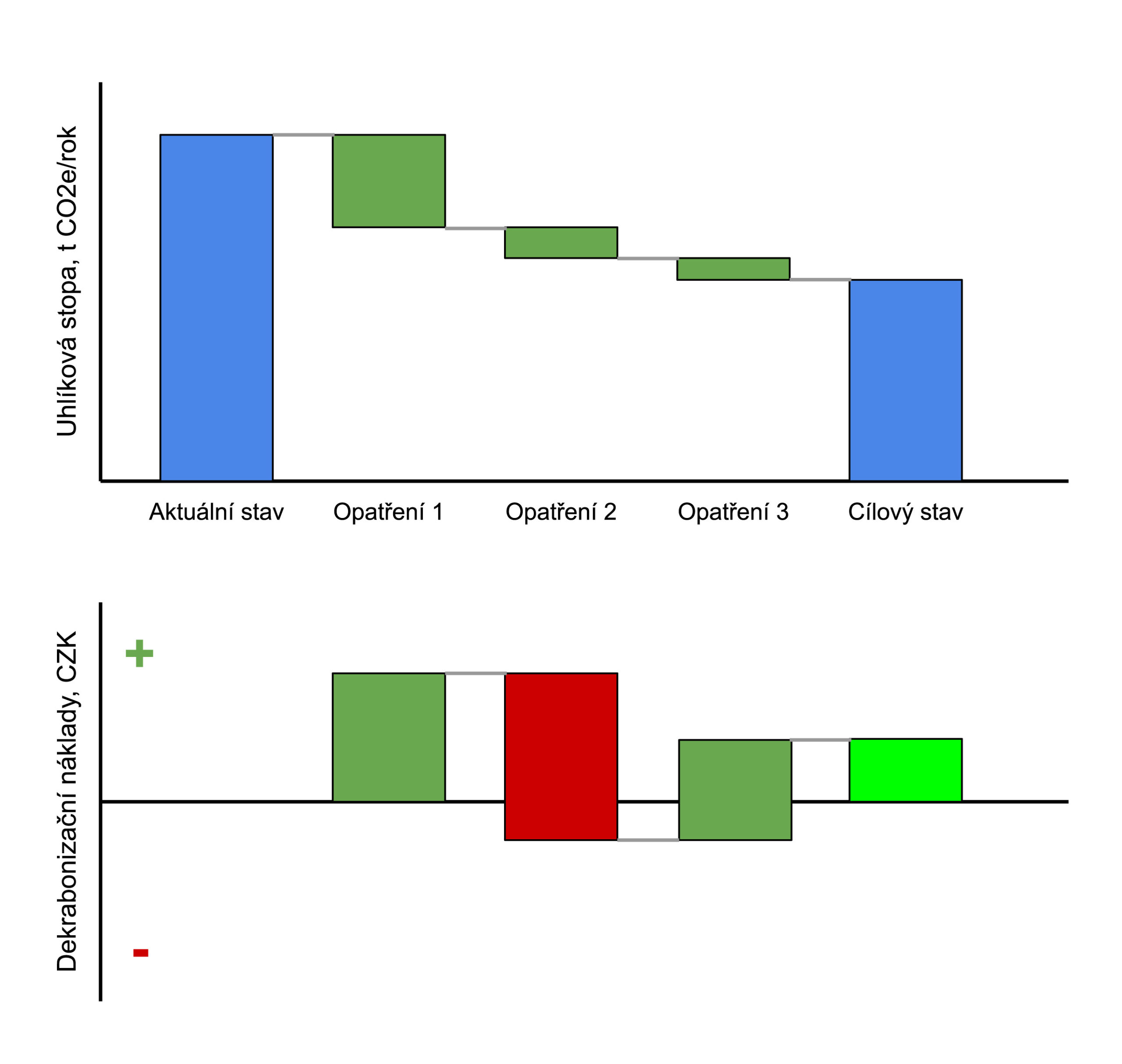 Obrázek ilustruje příklad dekarbonizační strategie. Horní graf znázorňuje aktuální stav, tři navržená dekarbonizační opatření a cílový stav. Na dolním grafu je pak vyčíslení ekonomiky těchto opatření. Opatření 1 a 3 přinášejí úspory, opatření 2 je naopak nákladem. Celková ekonomika dekarbonizační strategie je ale pozitivní.
